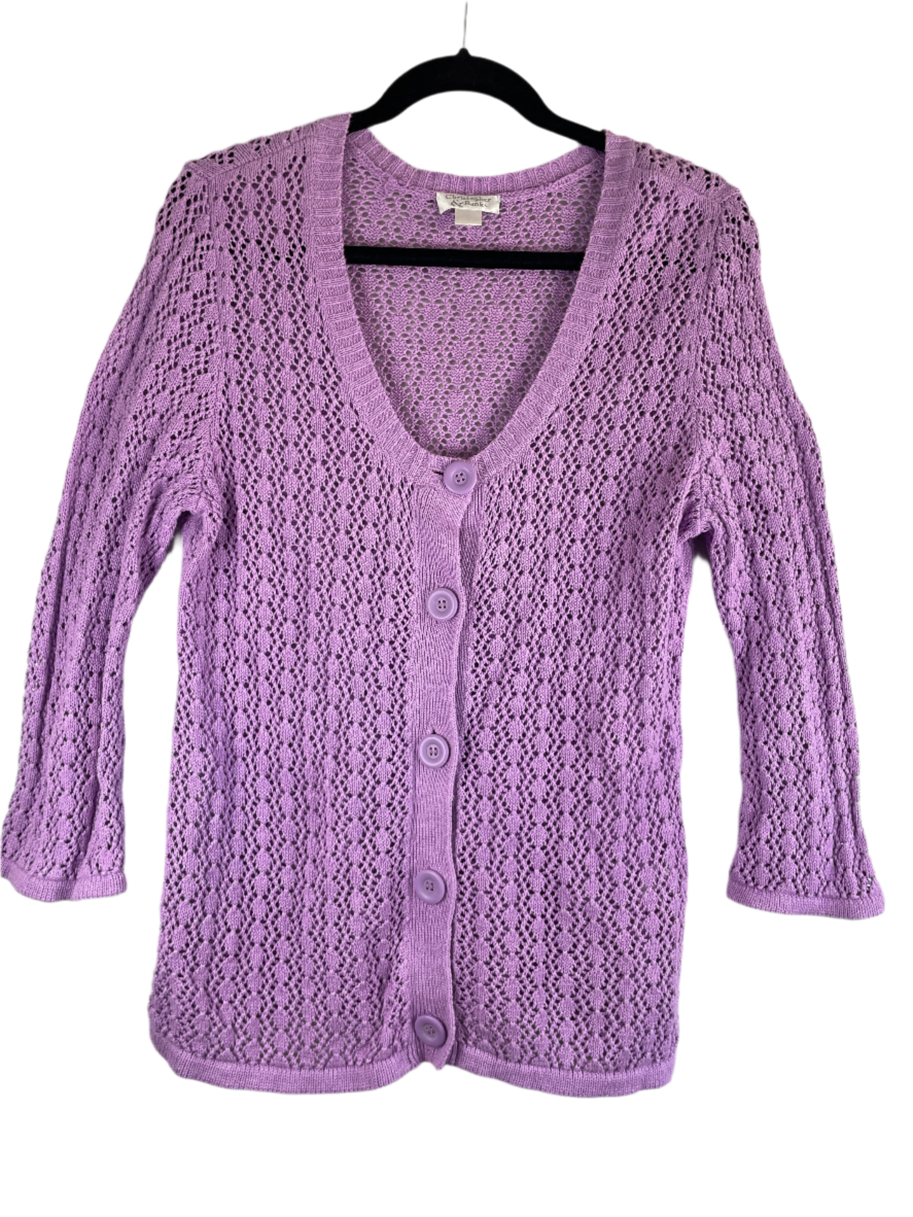 Lightweight and feminine, this lilac crochet cardigan by Christopher & Banks adds charm to any outfit. Features 3/4 sleeves, large front buttons, and a soft, breathable fabric blend of 55% ramie and 45% cotton. In excellent conditionwith no flaws noted.