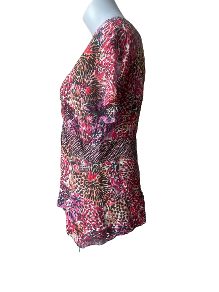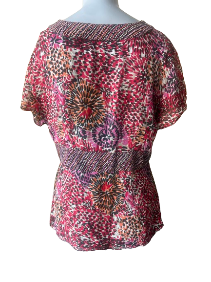 Transform your wardrobe with this secondhand JM Collection Red Mixed Print Short Sleeve Blouse! 🌺🌈 This stunning top features a beautiful multi-colour print that will make you stand out in any crowd. Elevate your style game and feel confident in this bold, eye-catching piece.