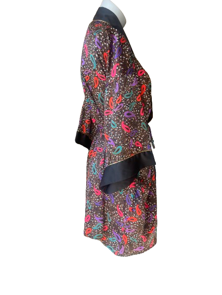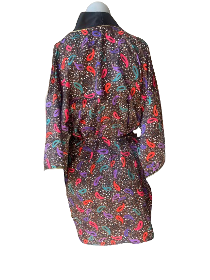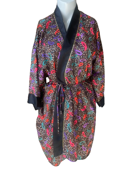 Indulge in luxury with the Kasara Vintage Black Robe! This beautiful black robe features a stunning paisley print in red, purple, and green. Feel elegant and chic while lounging at home. πΊπ₯