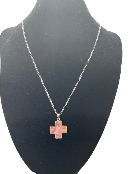 This necklace features a polished pink gemstone carved into a cross shape and suspended from a silver tone chain with a lobster clasp. The stone shows natural mottling and earthy inclusions characteristic of rhodonite, a genuine gemstone known for its soft pink tones and organic patterning.