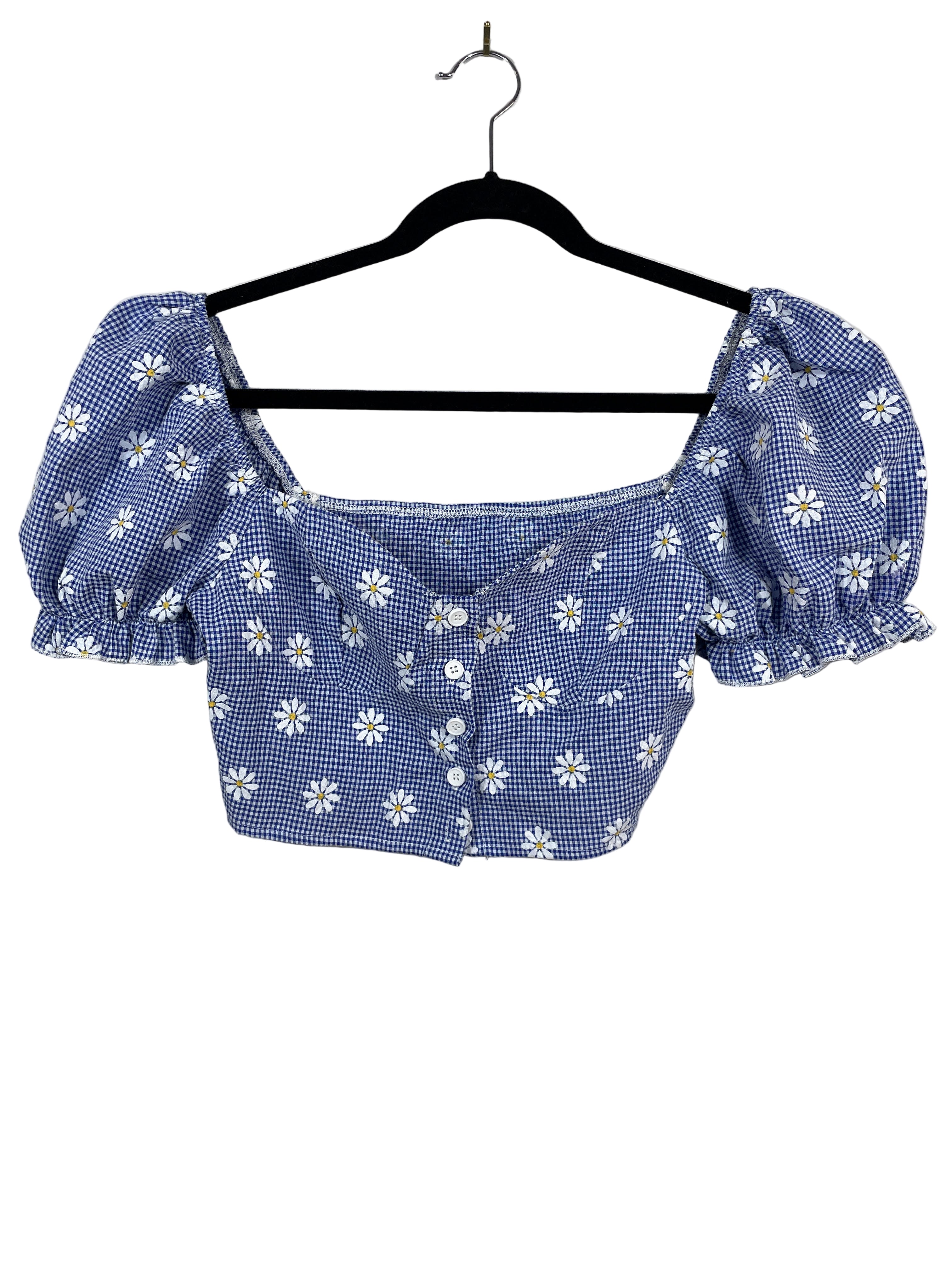 Blue and white checkered crop top with floral patterns on a hanger against a white background