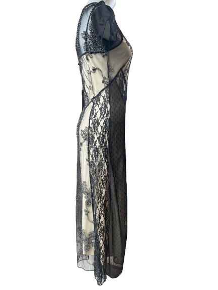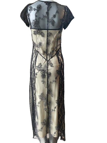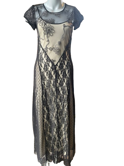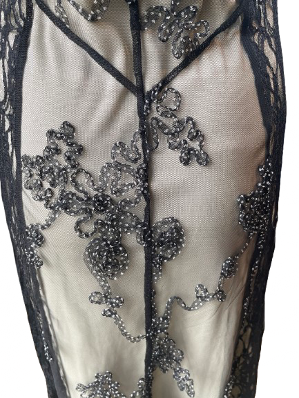 Step into sophistication with the Simon Chang Long Black Lace Overlay Dress. Drape yourself in beauty with the stunning black lace overlay, elegantly complemented by a cream slip underneath. Effortlessly make a statement at any event with this luxurious and exclusive dress.